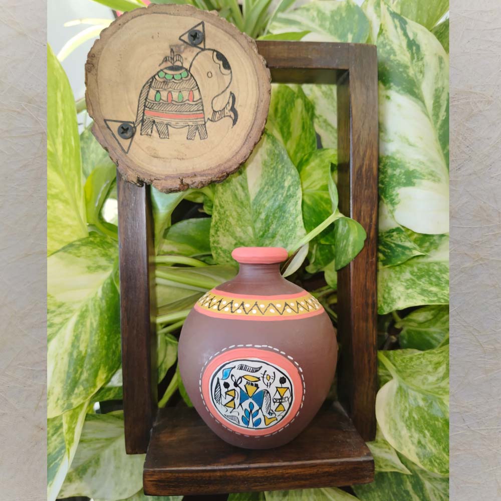 Handpainted Terracotta Brown Pot Set With Sheesham Wooden Frame Wall Hangin
