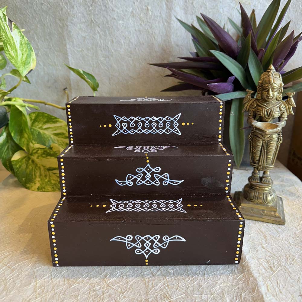 - Description: Hand painted kollam decorated steps/ golu stand in traditional red and white to display your Navaratri golu. This can be used individually or as a set with other stands from Aikiya's collection.