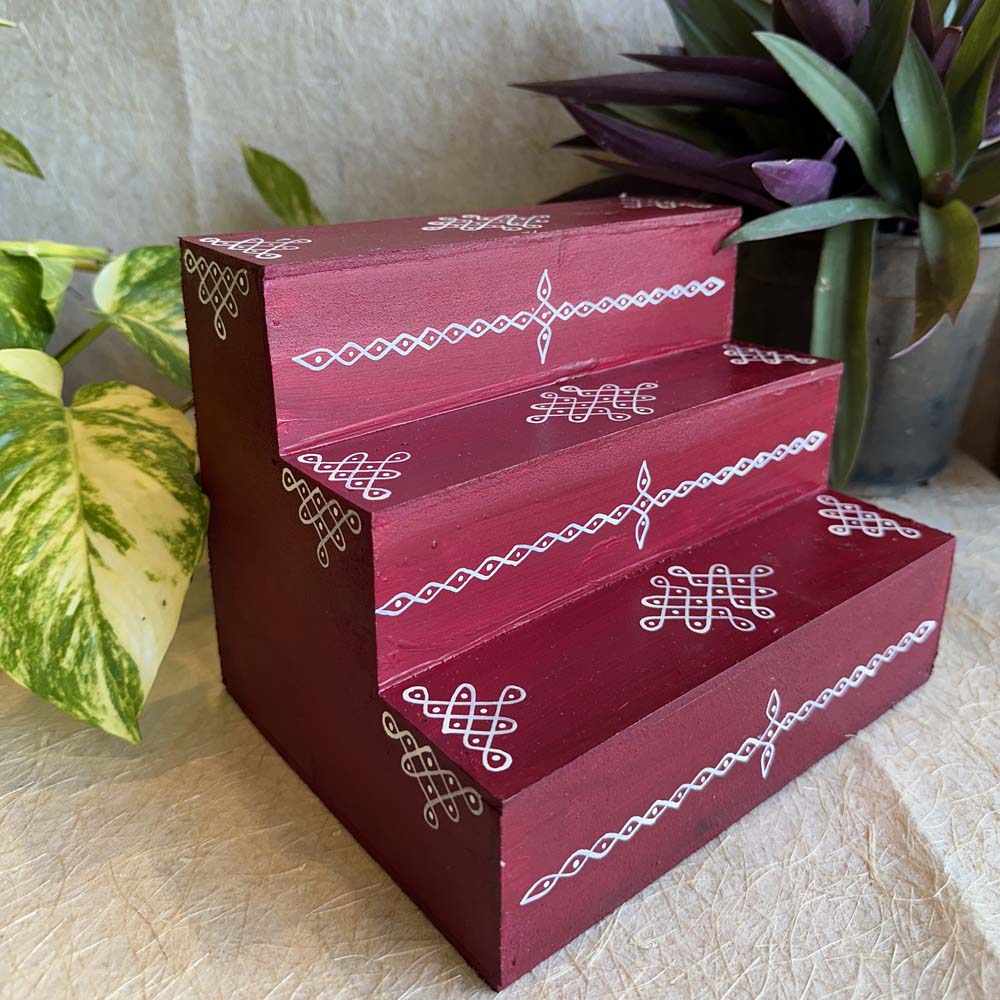 - Description: Hand painted kollam decorated steps/ golu stand in traditional red and white to display your Navaratri golu. This can be used individually or as a set with other stands from Aikiya's collection.